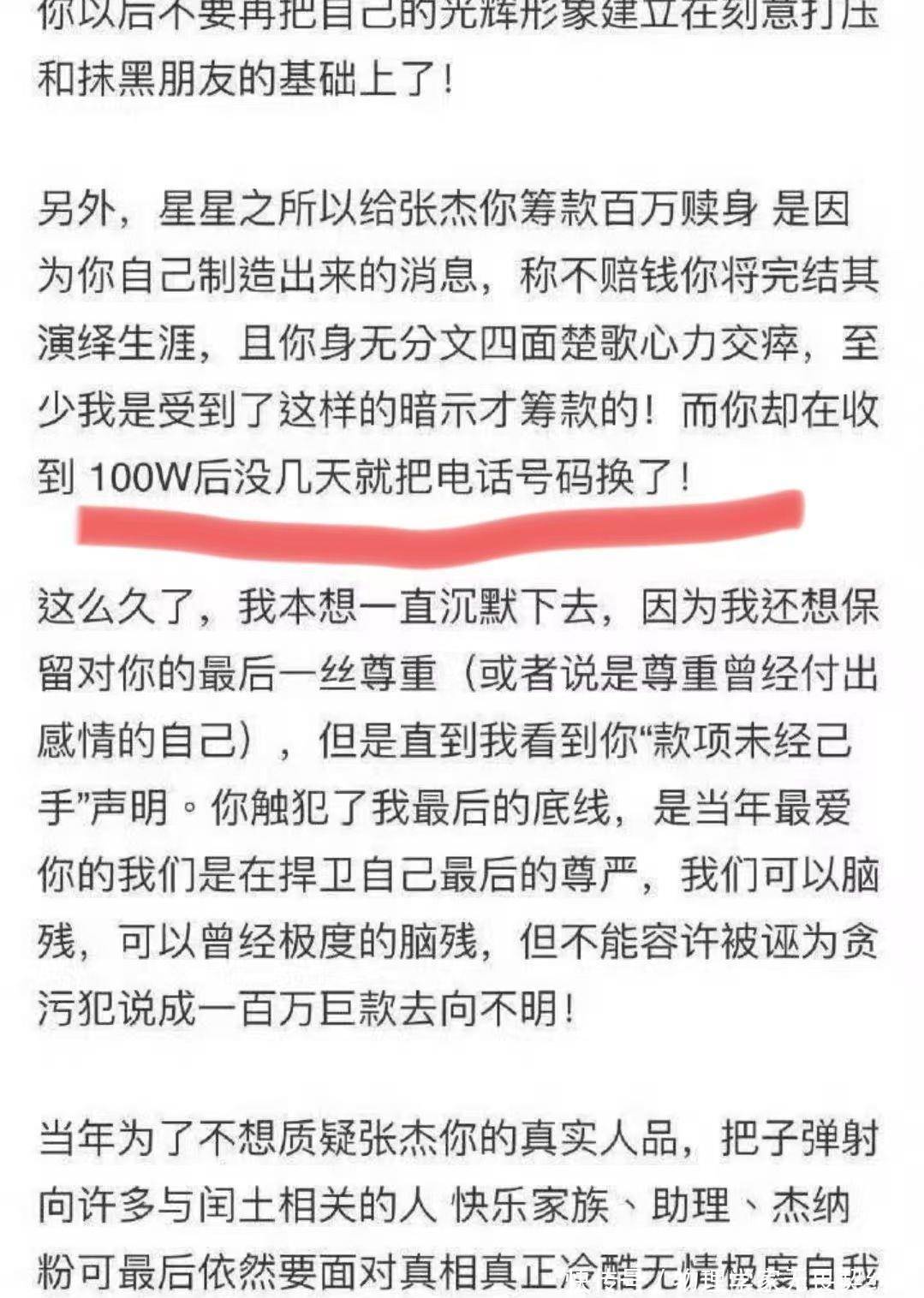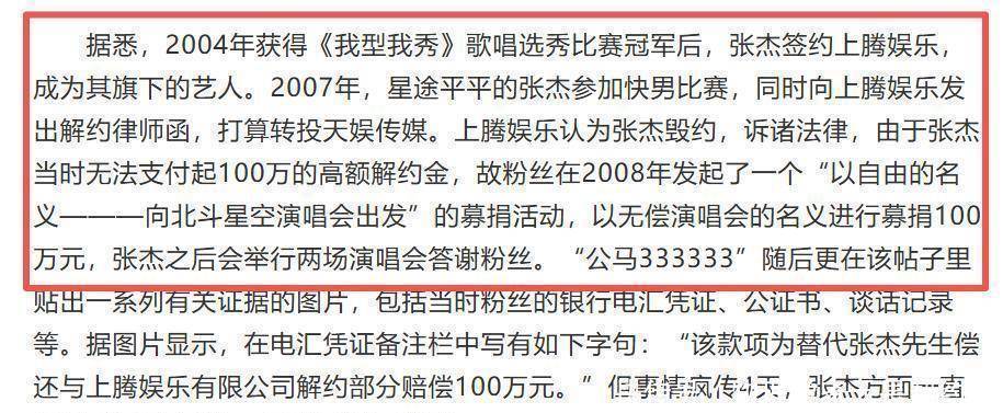 文中提到,有粉丝们自发为张杰募捐了100万违约金,还说当年张杰对粉丝隐瞒了真实情况。