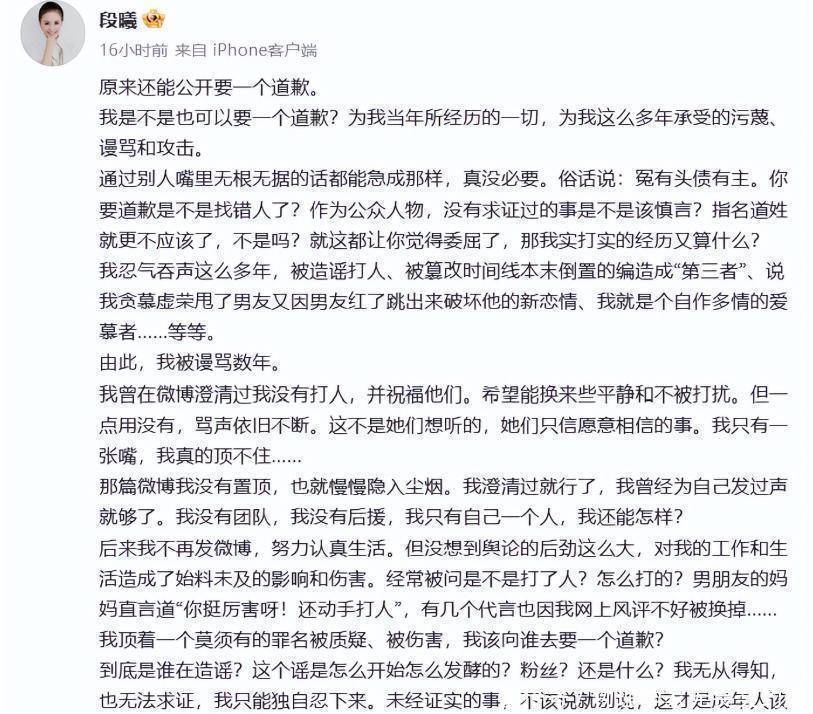 谢娜为张杰挺身而出之后,段曦立马发长文回应,说自己也曾被张杰伤害过,可到现在都没收到一句对不起。