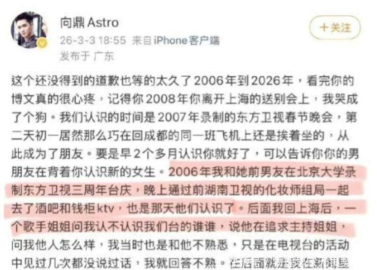 《加油好男儿》向鼎发在长文中透露,他曾亲眼看到张杰偷偷对谢娜示好,而背着女朋友段曦去追求她。